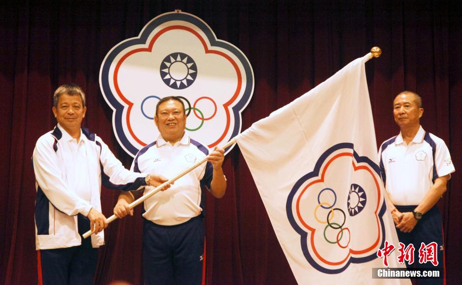 8月13日上午,中华台北代表队出席2014年第二届南京青年奥林匹克运动会(简称青奥会)授旗典礼。由48名运动员、18名教练员组成的中华台北队将参加青奥会14个项目的角逐。图为中华台北奥委会主席林鸿道(中)接过中华台北奥委会会旗。中新社发 林永传 摄