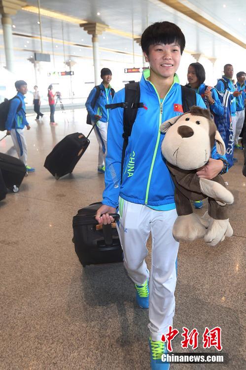 一位女运动员抱着玩具从高铁上下车。 泱波 摄