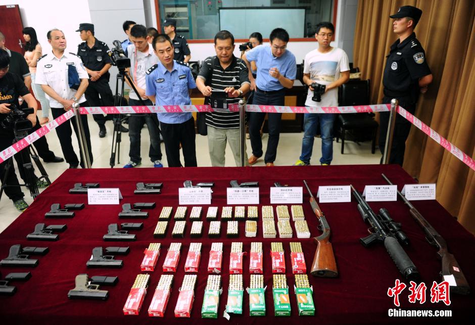 8月13日,湖北省公安厅举行新闻发布会,宣布湖北随州公安机关成功破获由中国公安部督办的2014年“1.6”特大走私武器弹药案。经过8个月的缜密侦查,案件涉及湖北、广西、云南、湖南中国四省(区)和境外柬埔寨、越南、缅甸三国,共抓获涉案人员8人,缴获各类走私国内外军警制式枪支16支、子弹 1789枚。经权威部门鉴定,这批国外走私进来的枪支系意大利“柏莱塔”、以色列“利器—沙鹰”、美国“格洛克”等世界著名的大口径制式枪支,性能优良,杀伤力强;国内仿制和自制的气枪、步枪,均有枪支所具备的杀伤力,属于刑法意义上的枪支。图为湖北警方展示缴获制式枪支弹药。 中新社发 张畅 摄