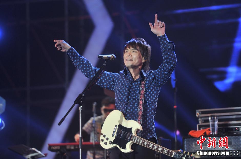 8月16日晚,2014重庆仙女山草原露营音乐节,台湾歌手温岚、伍佰空降重庆嗨翻全场与上万观众草坪上一同欢呼呐喊,共享这场音乐狂欢盛宴。图为伍佰献唱与观众互动。陈超 摄