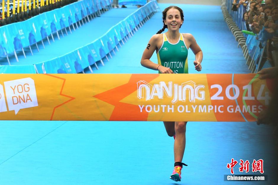 8月17日,在南京玄武湖举行的第二届夏季青年奥林匹克运动会铁人三项比赛中,来自澳大利亚的布里塔妮·达顿摘得青奥会首块金牌,美国和法国选手分获亚军和季军。泱波 摄