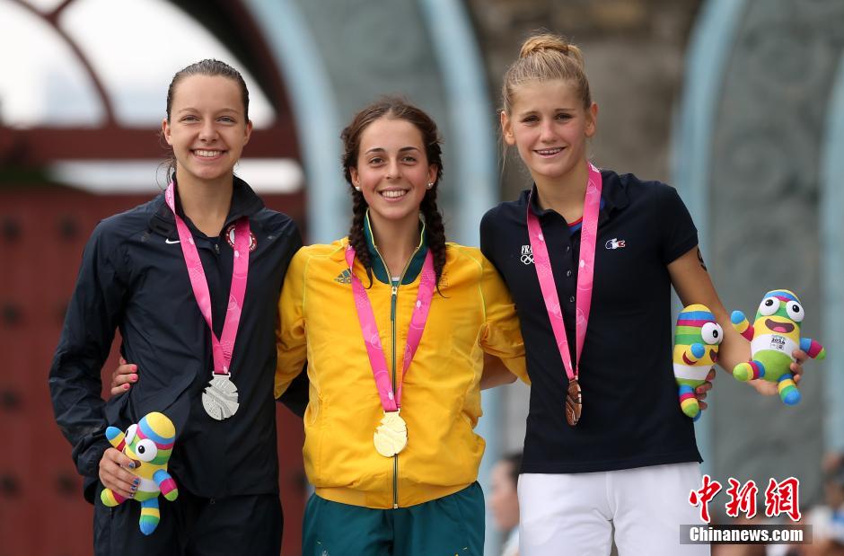 8月17日,在南京玄武湖举行的第二届夏季青年奥林匹克运动会铁人三项比赛中,来自澳大利亚的布里塔妮·达顿(中)摘得青奥会首块金牌,美国(左)和法国选手(右)分获亚军和季军。泱波 摄