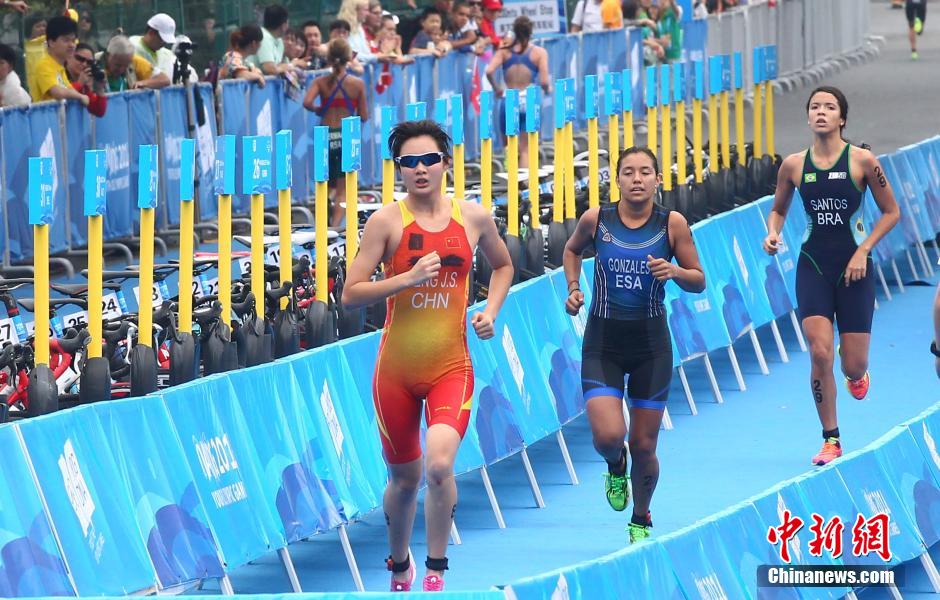 8月17日,参赛选手在南京玄武湖举行的青奥会铁人三项比赛中向终点冲刺。当日,第二届夏季青年奥林匹克运动会各项比赛陆续展开。泱波 摄