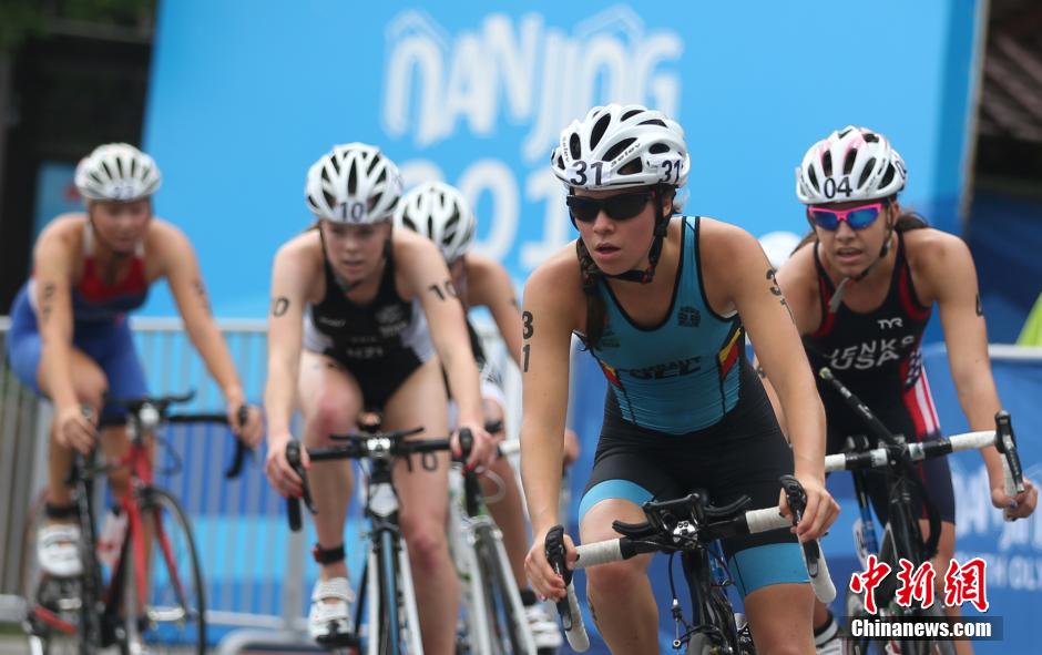8月17日,参赛选手在南京玄武湖举行的青奥会铁人三项比赛中骑自行车经过玄武门。当日,第二届夏季青年奥林匹克运动会各项比赛陆续展开。泱波 摄