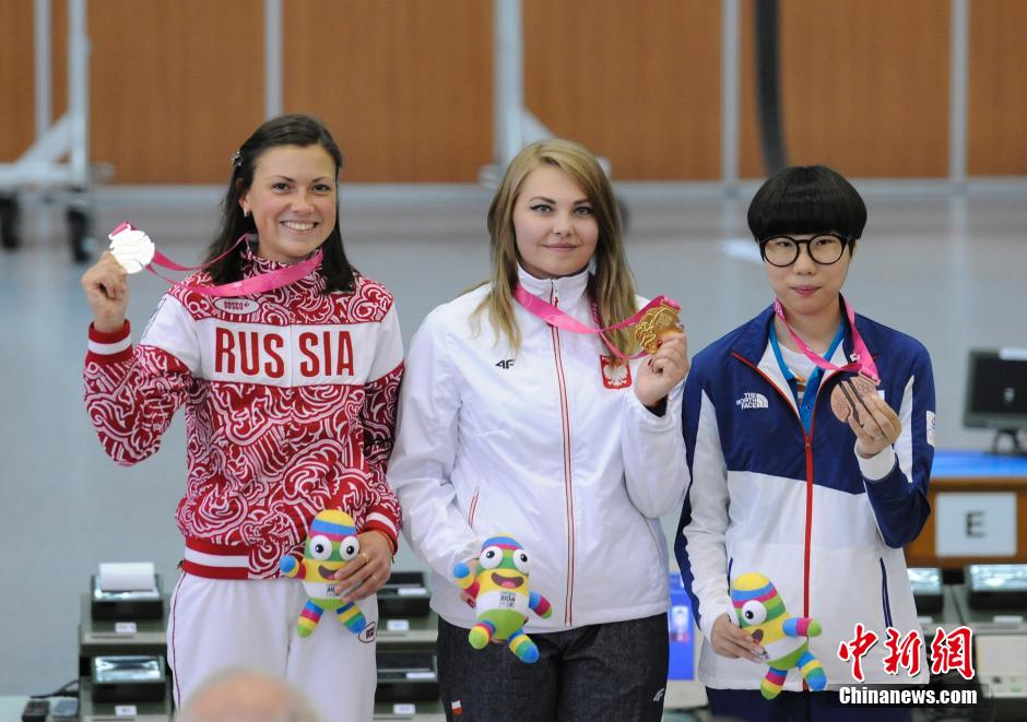 8月17日,第二届夏季青年奥运会女子10米气手枪比赛在方山体育训练基地举行决赛。波兰选手诺瓦克(中)以196.9环夺冠,俄罗斯选手洛莫娃(左)获亚军(194.4环),韩国选手金旼贞(右)获季军(175.4环)。中新社发 侯宇 摄