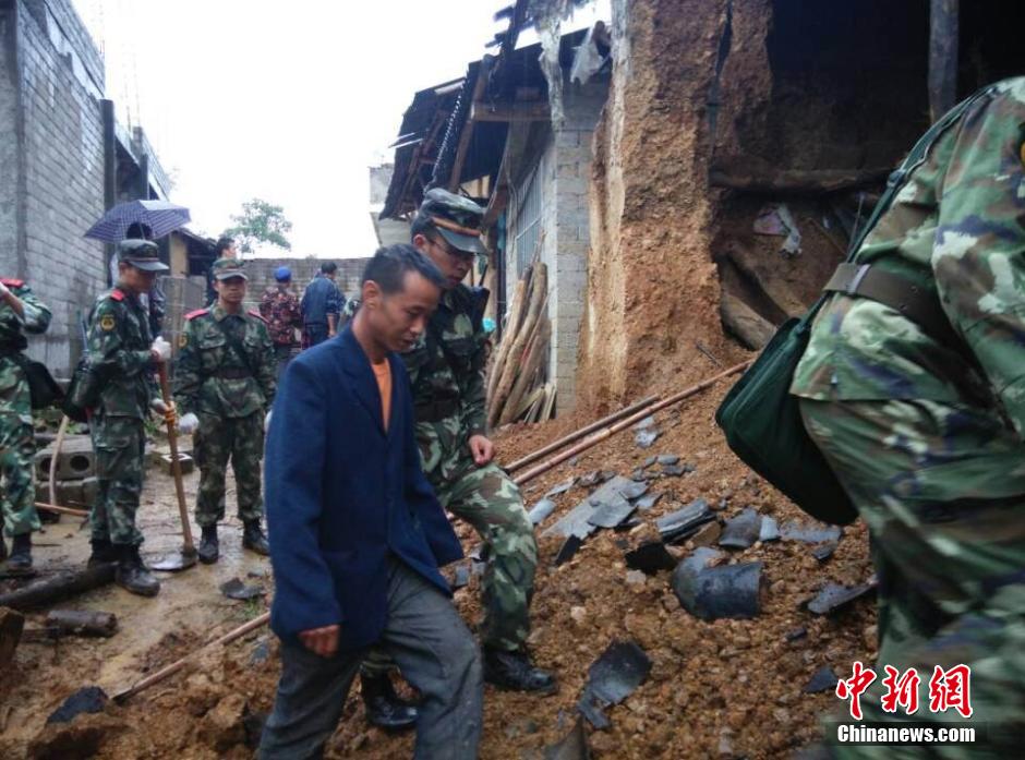 8月17日,昭通市永善县地震发生后,武警昭通支队永善中队15名官兵在中队长熊代程的带领下,立即奔赴灾区。一路上余震不断,山石滚落,熊代程果断下令徒步向灾区挺近。经过2个多小时的艰难行进,永善中队15官兵已于08时45分抵达震中务基镇波车区社展开救援。 中新社发 钟欣 摄