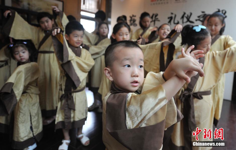 8月17日,山西太原举办义务国学大讲堂,少年儿童们身穿汉服,通过诵读国学经典,行中华礼仪的方式感受传统国学礼仪之美。图为少年儿童学习认识汉服的服饰特点。中新社发 韦亮 摄