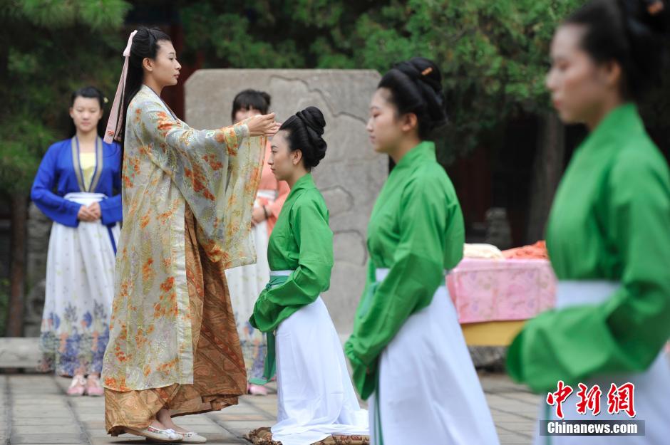 8月17日,三名即将年满18周岁的少女在山西太原文庙身着汉服,举行古代传统成人礼仪式,弘扬民族文化。中新社发 韦亮 摄
