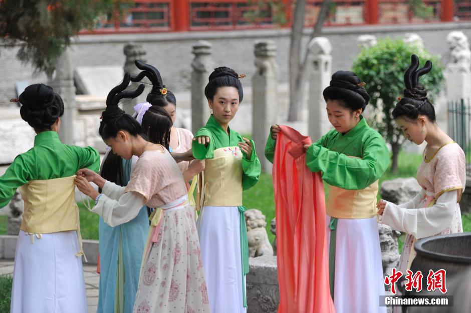 8月17日,三名即将年满18周岁的少女在山西太原文庙身着汉服,举行古代传统成人礼仪式,弘扬民族文化。中新社发 韦亮 摄