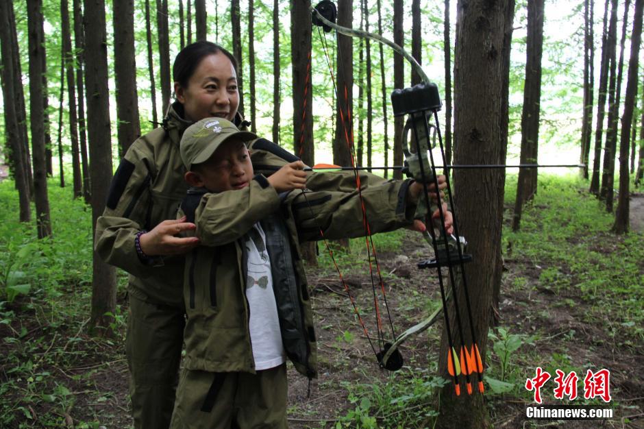 近年来,内地民众对亲子游的需求不断增大,使得亲子游市场发展迅速,目前正值暑假,“亲子露营”成为西安很多家长与孩子颇为青睐的休闲方式。图为母子二人搭弓射箭。张一辰 摄