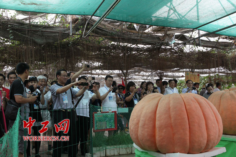 2014年8月6日下午,80余名来自全国教育系统劳模参观北戴河集发观光园。图为劳模们在参观“南瓜之王”。中工网记者 范治林 摄
