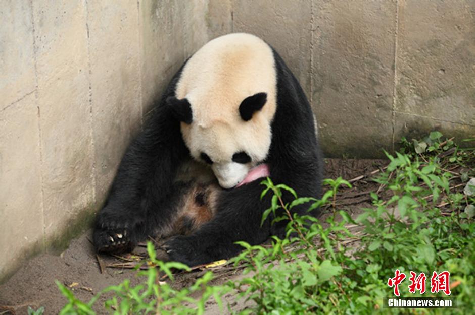 8月4日,中国保护大熊猫研究中心雅安碧峰峡基地对外宣布,海归大熊猫“苏琳”于8月3日下午在研究中心碧峰峡基地顺利产下一对双胞胎熊猫宝宝,这是今年中国保护大熊猫研究中心出生的首对双胞胎熊猫宝宝。图为苏琳叼起幼仔。 中新社发 罗波 摄