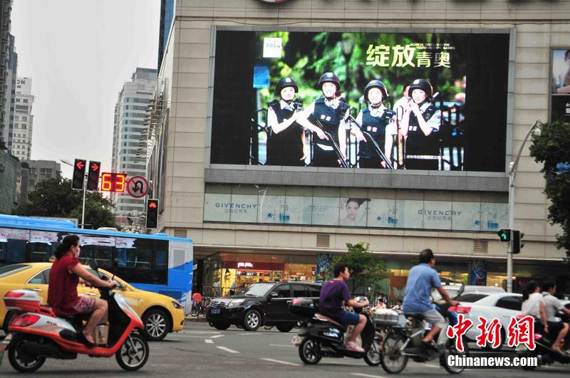 2014年8月6日上午,在上班高峰期,新街口、夫子庙两个重要商贸区的部分广告大屏上,播放了南京青奥秦淮警方安保系列海报,吸引了过路市民的注意。该系列主题海报共有8张照片,都是以集体人物为主题,并分别从参与、服务、奉献、守护、投入、保障、支持、绽放青奥等八个角度,展现了全体民警全力投入青奥安保工作的精神状态。图片来源:东方IC