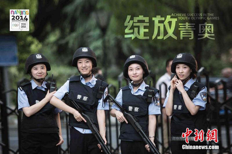 2014年8月6日上午,在上班高峰期,新街口、夫子庙两个重要商贸区的部分广告大屏上,播放了南京青奥秦淮警方安保系列海报,吸引了过路市民的注意。该系列主题海报共有8张照片,都是以集体人物为主题,并分别从参与、服务、奉献、守护、投入、保障、支持、绽放青奥等八个角度,展现了全体民警全力投入青奥安保工作的精神状态。图片来源:东方IC