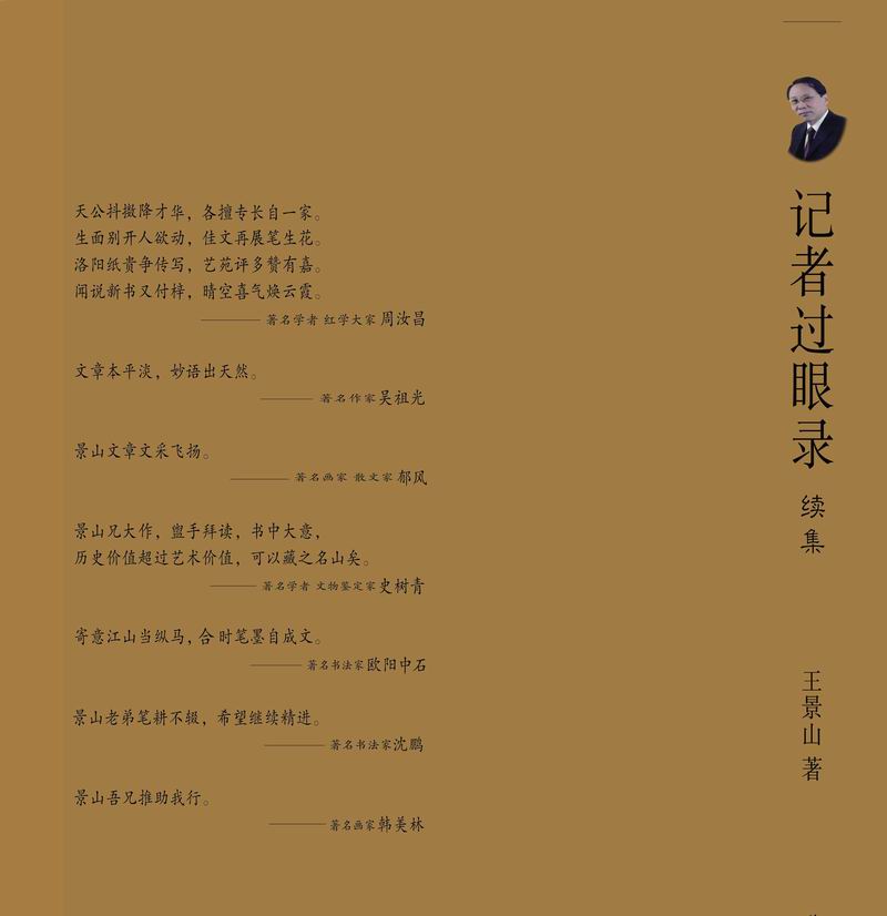 《记者过眼录续集》——由农业日报社记者王景山编写的、以记者亲身见闻为主要内容的纪实文学作品集即将出版。作者王景山,系中国作家协会会员、一级作家,高级记者,已出版6本专著。《记者过眼录续集》由作家出版社2014年8月出版,属纪实文学作品集,全书45万字,图片200多幅,可谓图文并茂。图为记者过眼录续集封面。