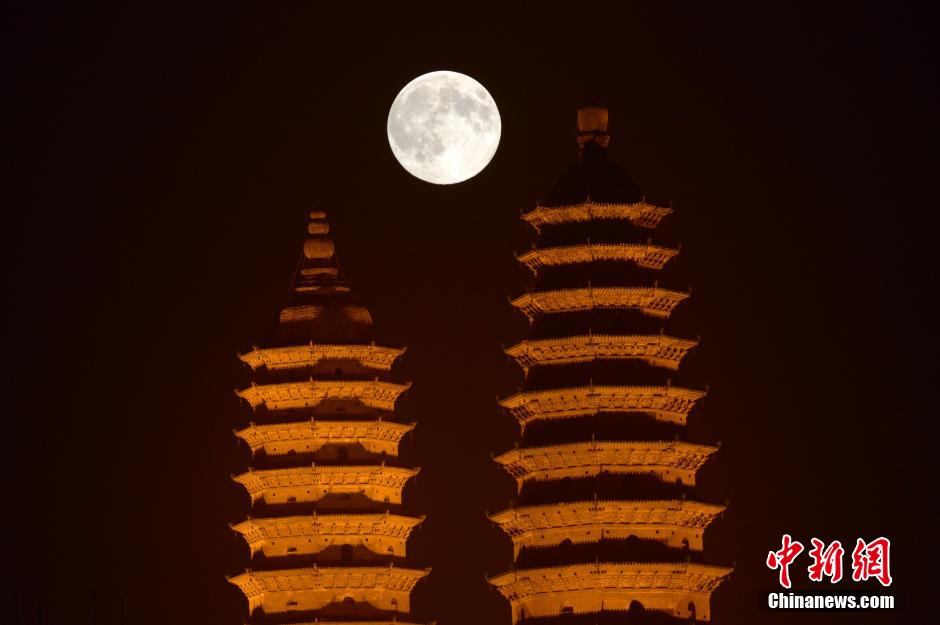 8月10日晚,一轮圆月亮相山西太原双塔寺上空。8月10日晚到11日凌晨,年度最大最圆的“超级月亮”将在空中上演。11日凌晨1点43分,月球运行到近地点,距离地球仅35.6896万公里。(双重曝光) 中新社发 韦亮 摄