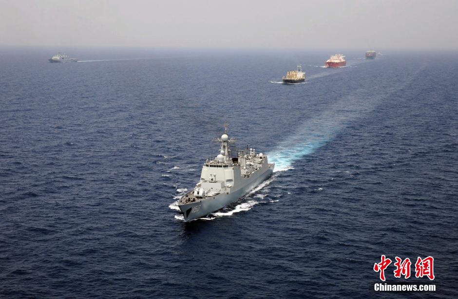 8月19日,由两栖登陆舰长白山舰、导弹护卫舰运城舰和3架舰载直升机组成的第18批护航编队经过18天的航行,抵达亚丁湾西部海域,与中国海军第17批护航编队会合,并开始联合执行第749、750批护航任务。中新社发 甘俊 摄