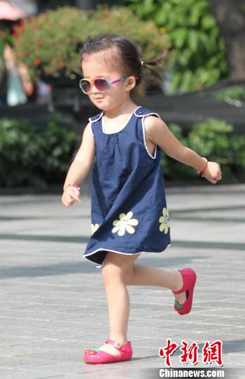 8月19日,重庆天气“变脸”,气温回升至34℃,小萝莉夏装穿出明星范街头“卖萌”。据重庆市气象台最新预测,升温模式已开启,该市大部分地区气温将冲上35℃。图为重庆街头,小萝莉夏装穿出明星范“卖萌”。周毅 摄
