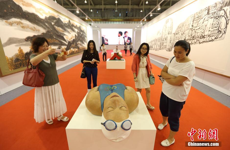 8月19日,观众被展出的美国艺术家卡罗尔·A·福莱曼的雕塑作品《奥运泳者》吸引。当日,南京青奥会美术大展在南京国际博览中心对外开放。据介绍,本次大展汇集了79个国家的艺术作品,包括中国画、油画、版画、瓷器、雕塑等500多件作品,艺术价值总估价高达百亿元。中新社发 泱波 摄
