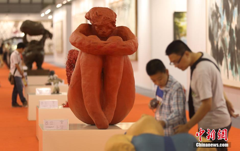 8月19日,观众被展出的塞尔维亚艺术家凡斯娜·S·潘特里克的雕塑作品《水球小子》吸引。当日,南京青奥会美术大展在南京国际博览中心对外开放。据介绍,本次大展汇集了79个国家的艺术作品,包括中国画、油画、版画、瓷器、雕塑等500多件作品,艺术价值总估价高达百亿元。中新社发 泱波 摄