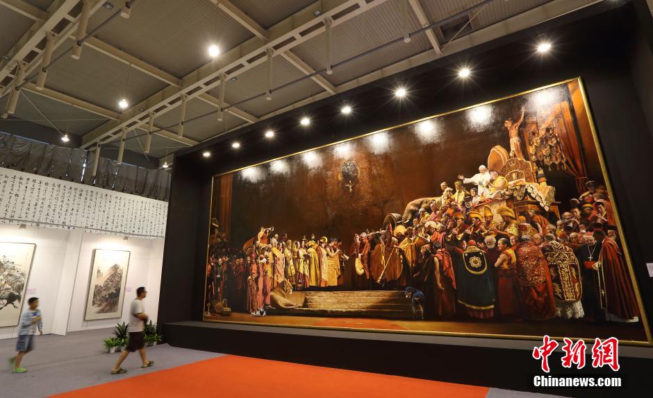 8月19日,观众被展出的塞尔维亚艺术家凡斯娜·S·潘特里克的雕塑作品《水球小子》吸引。当日,南京青奥会美术大展在南京国际博览中心对外开放。据介绍,本次大展汇集了79个国家的艺术作品,包括中国画、油画、版画、瓷器、雕塑等500多件作品,艺术价值总估价高达百亿元。中新社发 泱波 摄