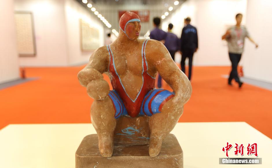 8月19日,观众被展出的塞尔维亚艺术家凡斯娜·S·潘特里克的雕塑作品《水球小子》吸引。当日,南京青奥会美术大展在南京国际博览中心对外开放。据介绍,本次大展汇集了79个国家的艺术作品,包括中国画、油画、版画、瓷器、雕塑等500多件作品,艺术价值总估价高达百亿元。中新社发 泱波 摄