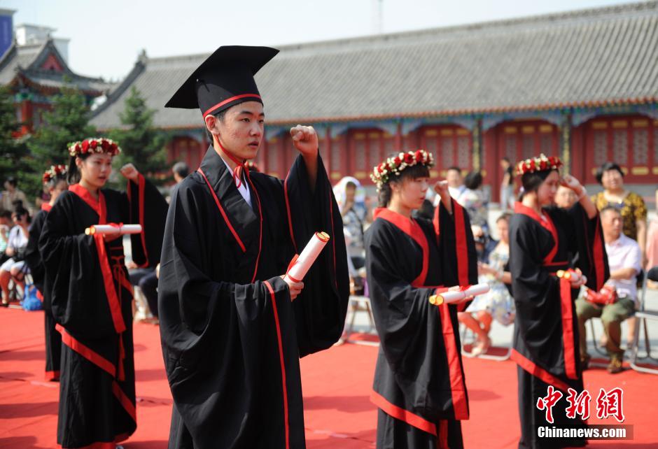 8月23日,在长春文庙大成殿前,数十名学子身穿古装举行了一场仿古成人礼。伴着古典音乐,学子们逐一完成醮礼、字礼、三拜等仪式,从而宣告自己正式步入成年之列。中新社发 张瑶 摄