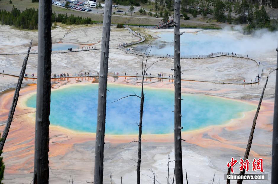 美国黄石国家公园是世界上最大的自然保护区之一,公园内森林茂密,空气清新,还有黄石湖、峡谷、瀑布、喷泉等。尤其是“蓝宝石喷泉”、“城堡泉”、“老忠实泉”、“狮群喷泉”等璀璨奇观令来自中国、印度、韩国、日本以及美国本土等游客大饱眼福、流连忘返。日前,中新社记者走进美国黄石公园,用镜头记录了公园内璀璨喷泉以及游客陶醉在大自然中的美景。中新社发 陈文 摄