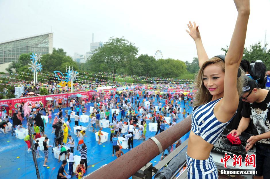 8月23日,美女DJ师热舞助兴民众泼水狂欢。当日,第二届济南泉水节在此间泉城公园开幕,千余民众泼水狂欢,共沐泉水滋润。中新社发 张勇 摄
