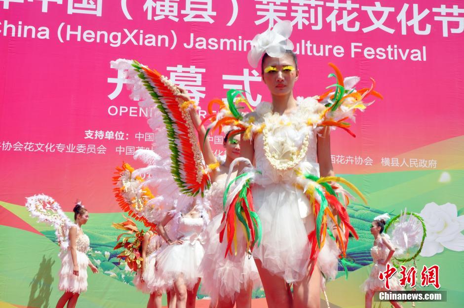 8月23日,2014年中国(横县)茉莉花文化节在“中国茉莉之乡”广西南宁市横县开幕,靓丽模特走秀推介茉莉花文化。横县至今已有400多年种植茉莉的历史,是全球最大的茉莉花生产和茉莉花茶加工基地,横县茉莉花产量和花茶加工总量均占全国80%以上,占世界的60%以上,年产值30多亿元人民币。当前,横县正积极打造中国茉莉花文化体验旅游品牌,构建面向广西、服务东盟的区域性特色旅游目的地。中新社发 黄艳梅 摄