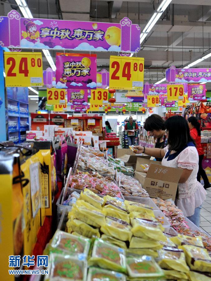 8月25日,消费者在天津的一家超市内选购散装月饼。随着中秋佳节的临近,月饼摆上了商家最醒目的柜台,不过因中央和地方狠刹月饼送礼之风,市场上的高端月饼礼盒和团体采购呈明显下降趋势。价格相对便宜的简装和散售“经济型月饼”受到消费者欢迎。新华社记者张晨霖摄