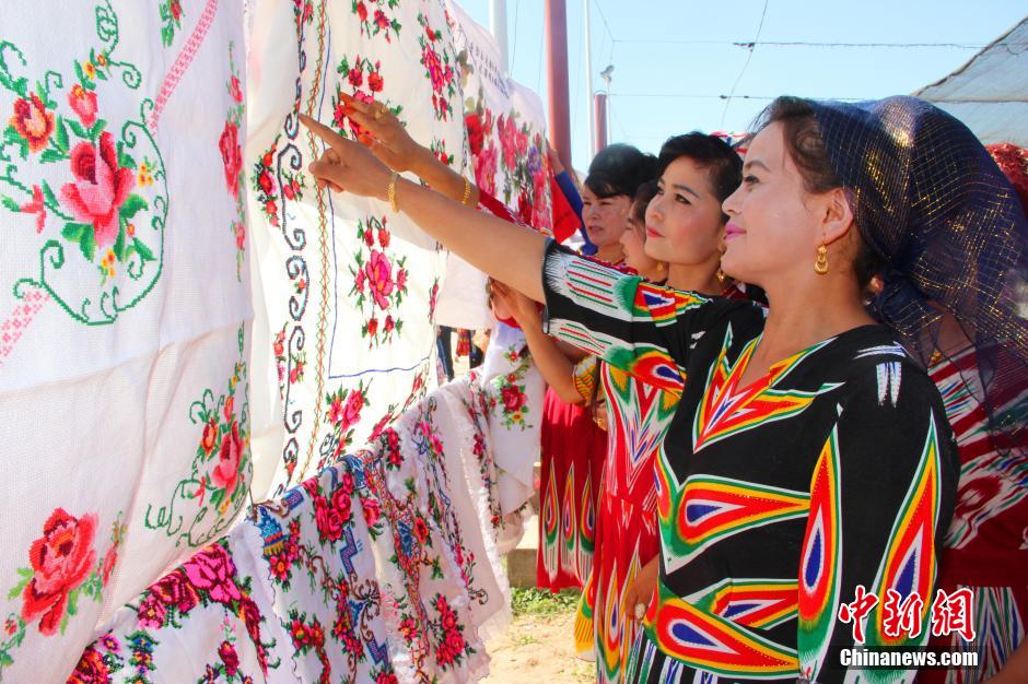 8月25日,新疆库车县比西巴格乡农村妇女举办了一场手工刺绣品展览会上,500多件妇女们的绣品参加了展览,绣品引来参观者的赞叹。图为妇女们在学习好的绣品。范红英 摄