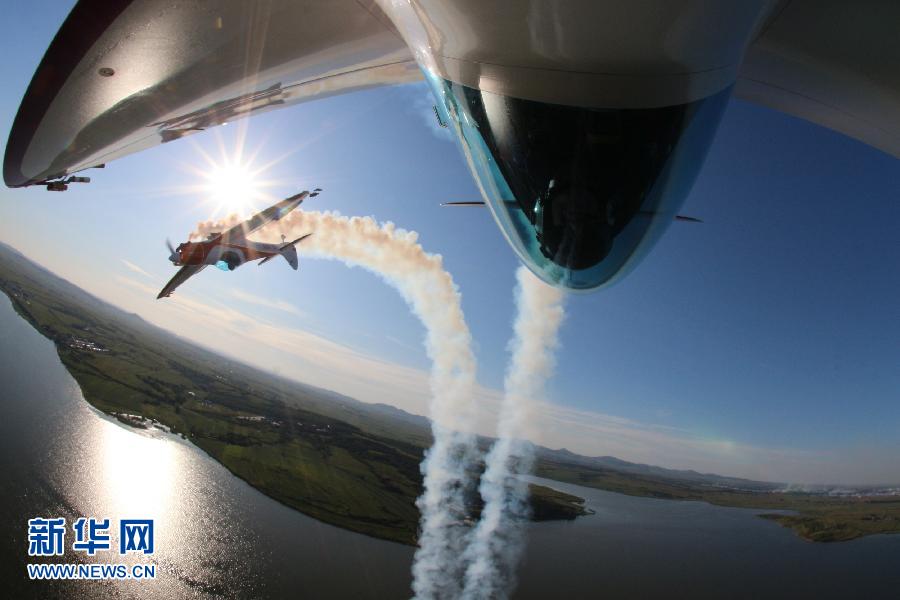8月26日,彼得驾驶飞机与盖一起编队飞越法库财湖。当日,来自英国的“龙卷风”飞行表演队在沈阳航展上进行来华后首次正式表演。“龙卷风”最具特色的是黄昏时刻的焰火表演,经过队长彼得亲手改装的超轻型特技飞机翼尖装载独立开发的发射系统,在空中飞行中释放美轮美奂的烟火,营造浪漫温馨的场面。其烟花特效表演,经过欧洲民航局认证,是欧洲唯一的编队烟火特技飞行表演队。组队4年来他们参加了欧洲几乎所有的航展,已进行过超过250场演出。队长彼得在南非创建了飞机综合维修公司,把从德国通航展上发现的一种模型飞机打造成可载人的特技飞机,这就是“龙卷风”飞行队座机的来历。彼得的搭档是工程师出身的盖,盖从滑翔机开始学习飞行,现在是英国航空公司波音747、787客机的机长,并且经常直飞伦敦至成都的航线。两位DIY的高手对自己的飞机了如指掌,虽然法库航展只安排他们在白天飞行,并不是他们擅长的傍晚,他们根据客观条件临时改装飞机,使焰火效果能够尽量完美。新华社发