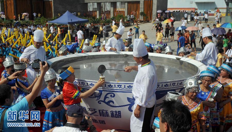 8月27日,员工用300个磨共同研磨黑芝麻。当日,南方黑芝麻文化节在广西容县经济开发区广西南方黑芝麻集团公司厂区举行,近千名员工和现场嘉宾在世界纪录协会认证官的监督和认证下,共创三项世界纪录。898人共同研磨黑芝麻,然后装入一个直径3.49米、高1.58米的巨碗中,并和现场嘉宾共1059人同吃巨碗中的黑芝麻糊,创下“世界上最多人同时研磨黑芝麻”、“世界最大碗黑芝麻糊”和“世界上最多人同吃黑芝麻糊”三项世界纪录。新华社记者陈建力摄