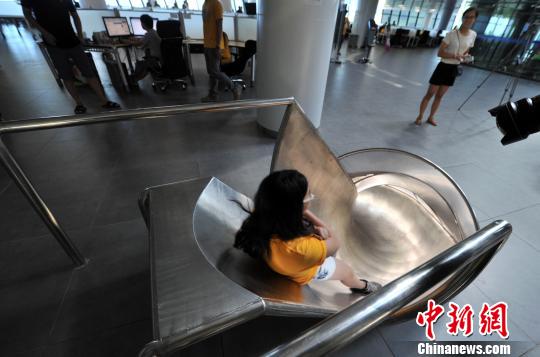 8月28日,福州网龙公司的员工在办公室滑滑梯。该滑梯可直接从三层办公室滑下一楼,据公司员工介绍,这样可以缓解疲劳、释放压力,下班还可以减少电梯拥堵。