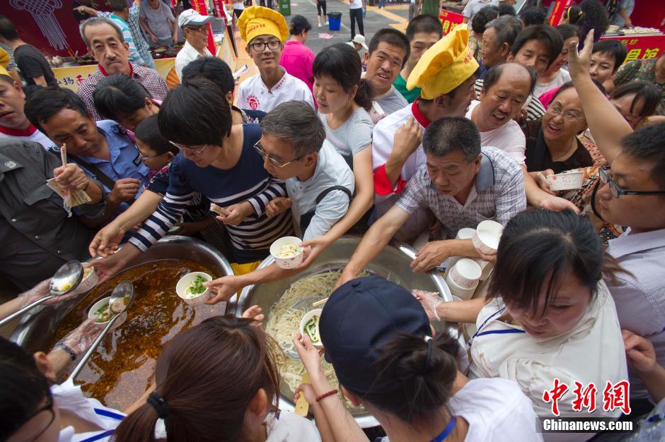 8月28日,山西太原,上百名削面师向一口巨型大锅中削面,煮好的面即分给前来参观的民众品尝。当日,由中国饭店协会、太原市人民政府共同主办,以“弘扬面食文化,促进产业发展”为主题的“2014中国(太原)面食文化节”在山西太原开幕。来自中国各地的风味小吃、名吃等在此集中亮相,让当地民众尽情品尝舌尖上的美味。图为民众争相品尝刀削面。中新社发 张云 摄