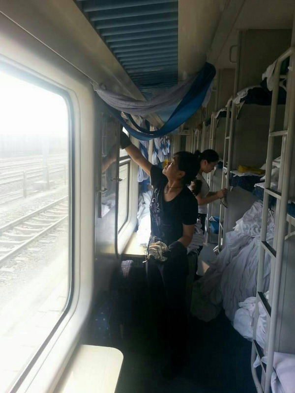 青岛客运段烟京车队为全面落实“三个出行”工作要求,利用库内整备、途中重点区段等时机,全力组织进行车体的卫生整治工作。车队干部以身作则,让干净漂亮的车厢说话,做出样子,干出标准。全体职工齐心协力,不辞辛苦,打扫出物见本色、干净闪亮的列车车厢,为旅客出行创造温馨,舒适的旅行环境。图为烟京车队三组库内卫生整备。