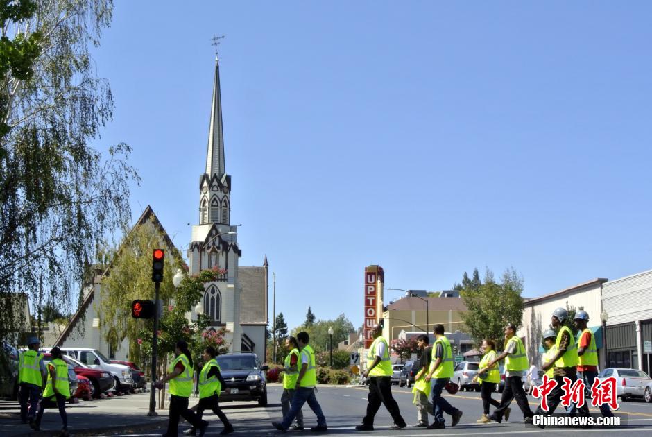当地时间8月31日,美国加州纳帕酒乡市中心, 一群维修工人经过马路,他们右侧的教堂在8月24日凌晨的6级地震中遭到严重破坏。纳帕市政府估计私人住宅和商业建筑损失约3亿美元。中新社发 刘丹 摄