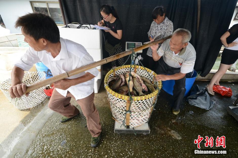 9月1日,苏州市民到当地光福镇渔港码头赶集,购买刚从太湖里捕捞上来的水产品“尝鲜”。当日,江苏苏州太湖结束了为期7个月的封湖禁渔期,迎来了秋汛开捕的第一天,当地渔民正式进入太湖进行捕捞。随着太湖的全面开捕,沿湖市场的水产品价格预计近期将有所下降。据了解,今年太湖共计投放花鲢、白鲢、青鱼、大银鱼卵等苗种约162万斤,5273万尾,总产量将比去年有所增加。图为工作人员将捕捞上来的鱼过磅后搬运到码头出售。王思哲 摄
