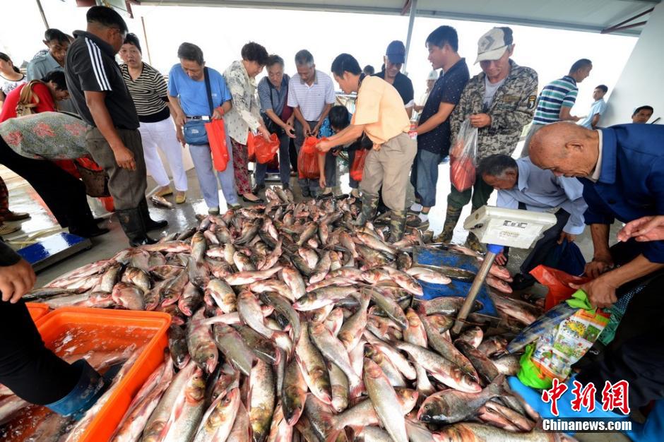 9月1日,苏州市民到当地光福镇渔港码头赶集,购买刚从太湖里捕捞上来的水产品“尝鲜”。当日,江苏苏州太湖结束了为期7个月的封湖禁渔期,迎来了秋汛开捕的第一天,当地渔民正式进入太湖进行捕捞。随着太湖的全面开捕,沿湖市场的水产品价格预计近期将有所下降。据了解,今年太湖共计投放花鲢、白鲢、青鱼、大银鱼卵等苗种约162万斤,5273万尾,总产量将比去年有所增加。图为市民到渔港码头赶集,购买太湖水产品“尝鲜”。王思哲 摄