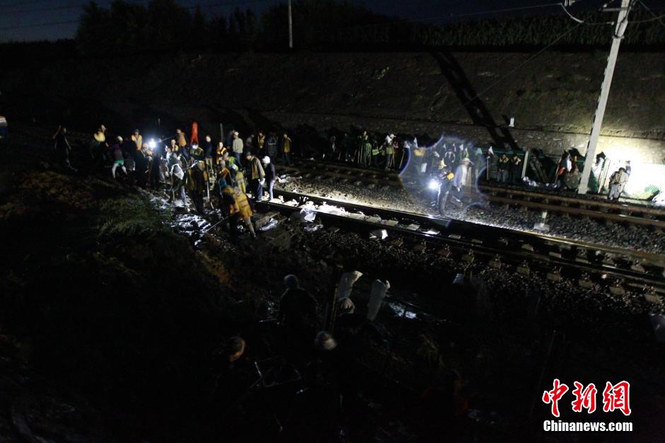9月1日16时50分左右,由青岛发往西宁的T373次旅客列车运行至兰青线老鸦站至乐都站间,由于线路左侧村民浇地致护坡坍塌,泥石侵入铁路,造成机车故障,使列车无法运行。经过近200多人对淤泥的紧张清理,T373次列车已于19时16分更换机车,恢复运行,该列车晚点2小时30分后到达终点西宁。图为事发现场工作人员正在清理淤泥。中新社发 胡贵龙 摄