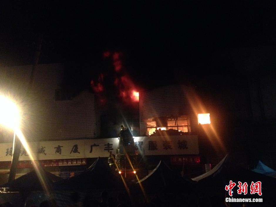 哈尔滨市道外区仁里街马克威商场发生火情,该商场总共有三层,目前基本全部过火,现场仍有明火并且有大量的浓烟冒出,消防部门正在全力扑救。图为火势现场。中新社发 魏来 摄