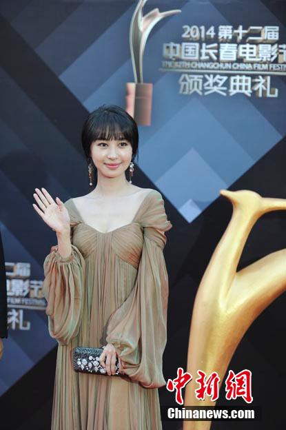 8月31日晚,第十二届中国长春电影节落下帷幕,在揭晓各项“金鹿奖”之前,众明星依次走上电影节星光大道的红毯。图为李菲儿。 张瑶 摄