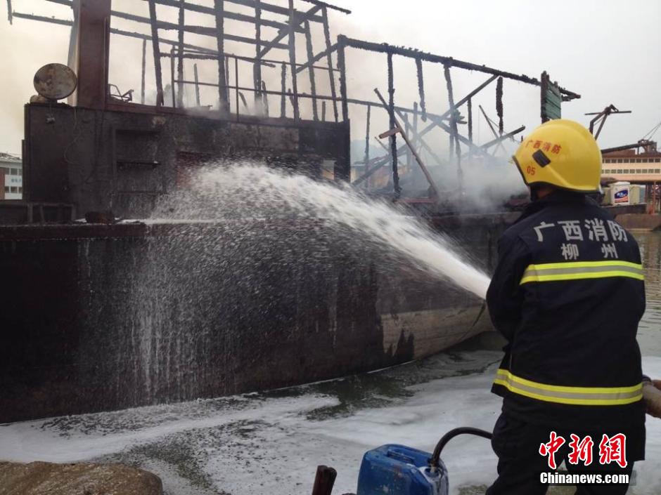 8月31日17时50分许,广西柳州市柳城县柳城大桥下一艘200吨位的运沙船,因煤气泄露发生火灾,明火熊熊燃烧,冒出滚滚浓烟。船主因液化气罐爆燃致局部烧伤后跳入江中逃生。最终,火势经柳城县消防官兵一个多小时的救援,得以扑灭。目前,伤者已被送往医院治疗。图为消防官兵正在救援。 梁富 摄