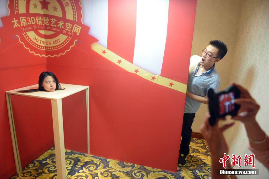 9月2日,山西太原,民众在“3D错觉艺术空间”展馆体验“错觉艺术”。该展馆展出的3D立体艺术空间作品全部由山西大学美术学院毕业生创作。这种空间作品打破了立体绘画和二维视觉界限,利用“障眼法”、观赏角度等因素,给体验者一种视觉错位的立体感觉。中新社发 韦亮 摄