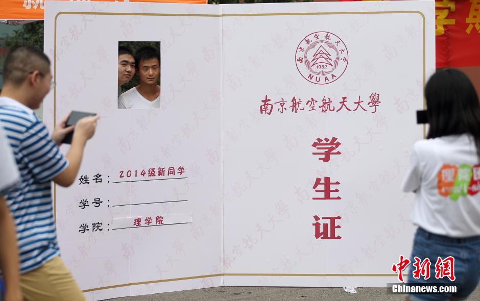 9月2日,南京航空航天大学新生在超大“学生证”的证件照位置拍摄照片。眼下正是内地各大高校新生报到的时候,各种迎新方式创意迭出。中新社发 泱波 摄
