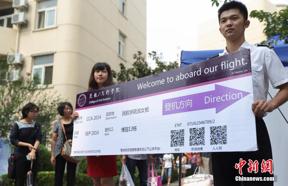 9月2日,南京航空航天大学新生报到日,该校民航(飞行)学院飞行学院的学生手持超大机票指引新生们办理入校手续。眼下正是内地各大高校新生报到的时候,各种迎新方式创意迭出。中新社发 泱波 摄