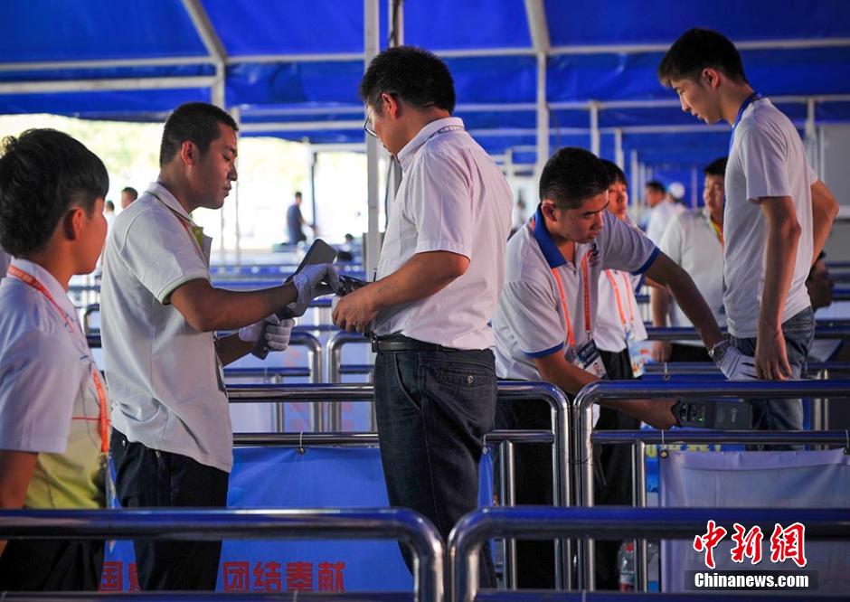 9月2日,第四届中国—亚欧博览会举办地——乌鲁木齐的新疆国际博览中心南门人员入口处,入场人员随身携带的背包已经过安检机扫描,但安保人员仍会对个别背包进行开包检查。图为新疆国际博览中心南门人员入口,每一名入场人员都需经过严格安检。刘新 摄