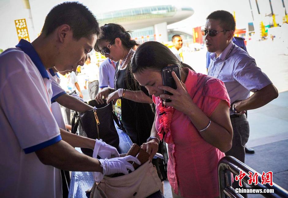 9月2日,第四届中国—亚欧博览会举办地——乌鲁木齐的新疆国际博览中心南门人员入口处,入场人员随身携带的背包已经过安检机扫描,但安保人员仍会对个别背包进行开包检查。图为新疆国际博览中心南门人员入口处,入场人员随身携带的背包已经过安检机扫描,但安保人员仍会对个别背包进行开包检查。刘新 摄