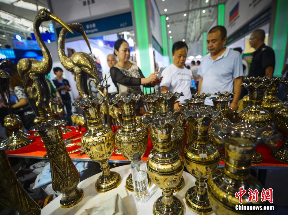 9月2日,第四届中国—亚欧博览会在乌鲁木齐的新疆国际博览中心如火如荼的进行中,来自巴基斯坦工艺精湛的铜器吸引众多参观者。中新社发 刘新 摄